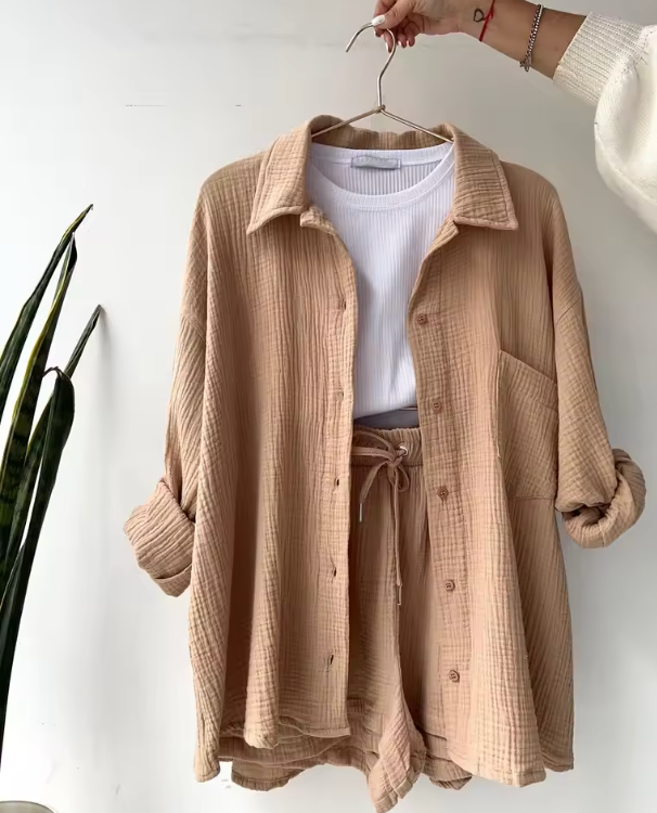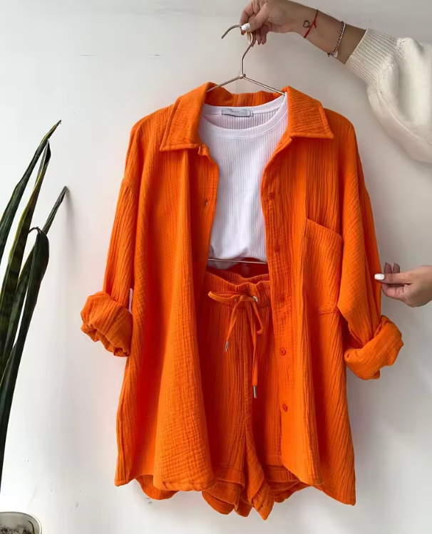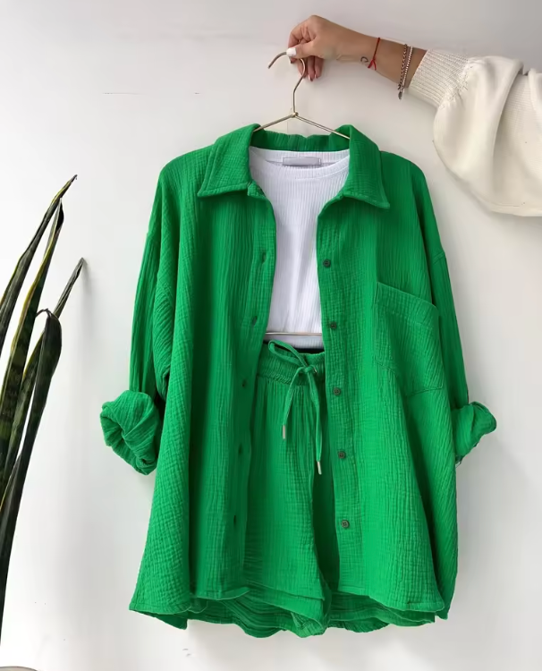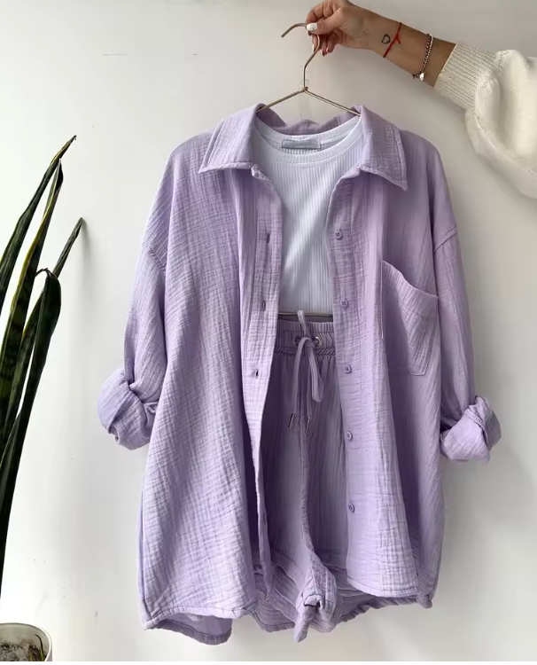 Offrez à votre garde-robe une touche de fraîcheur avec cet ensemble coordonné en gaze de coton fuchsia. Composé d’une chemise ample à manches longues et d’un short taille haute avec cordon ajustable, cet outfit est à la fois moderne et ultra confortable. Le tissu gaufré respire, ce qui le rend parfait pour les journées ensoleillées ou les escapades stylées en ville.