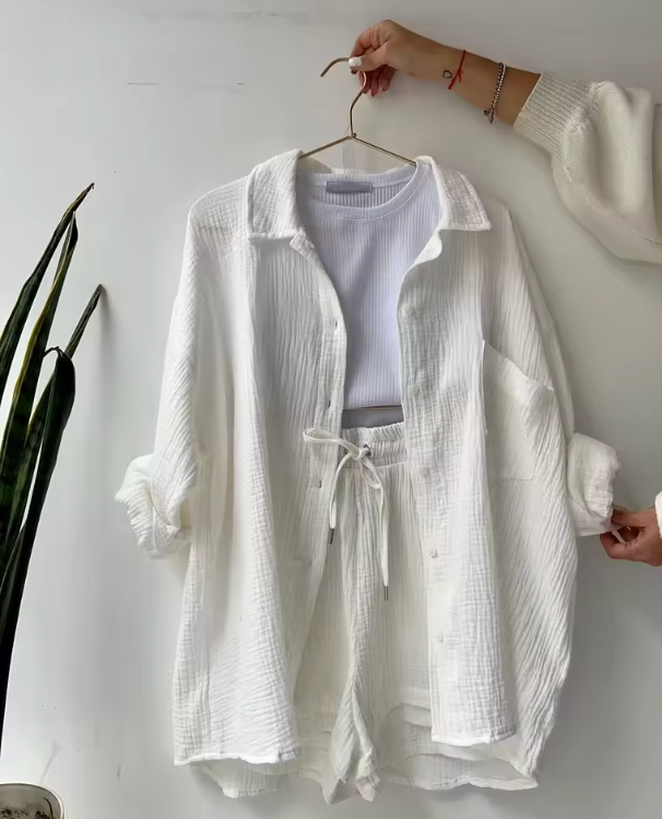La coupe oversize de la chemise contraste joliment avec le crop top blanc ajusté (non inclus), créant un équilibre parfait entre décontraction et féminité. Le short, quant à lui, épouse délicatement les hanches tout en assurant une liberté de mouvement optimale. Portez-le avec des sneakers pour un look streetwear, ou avec des sandales dorées pour une touche plus estivale.