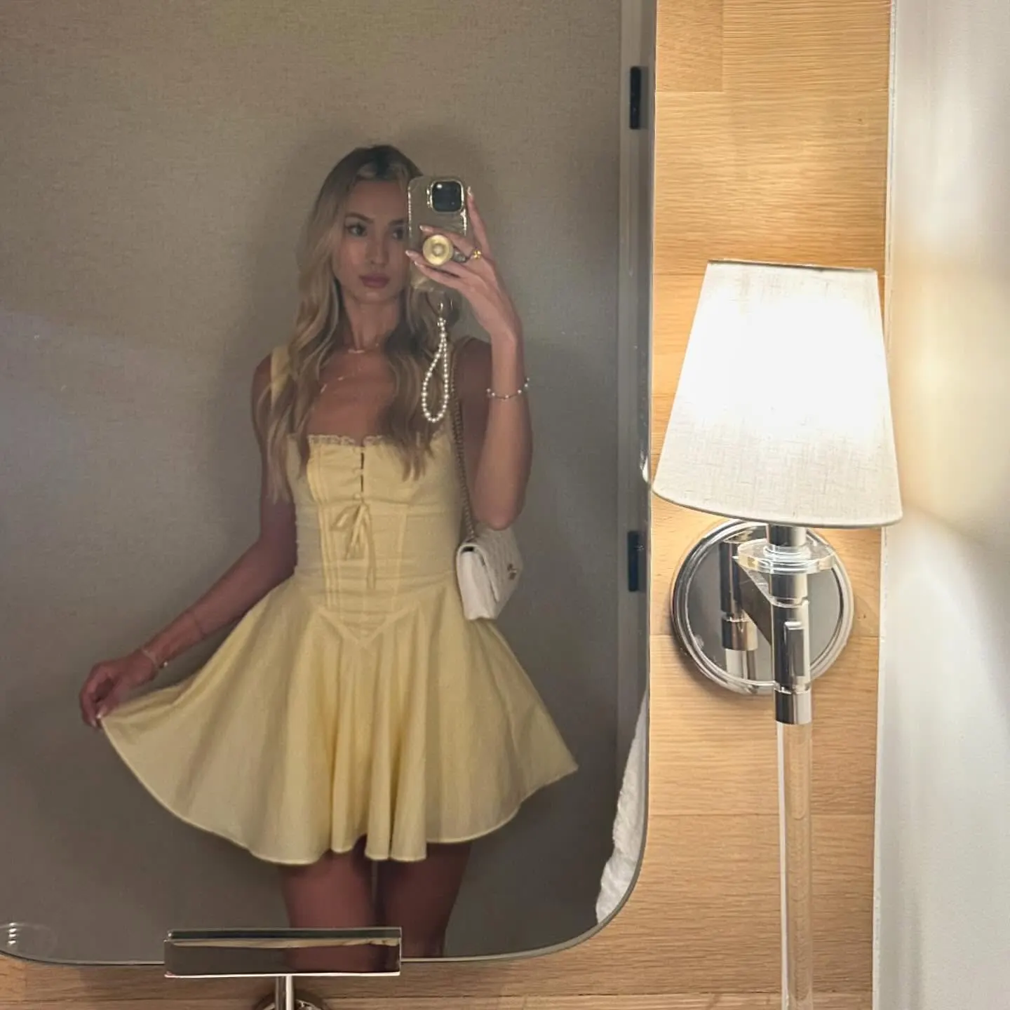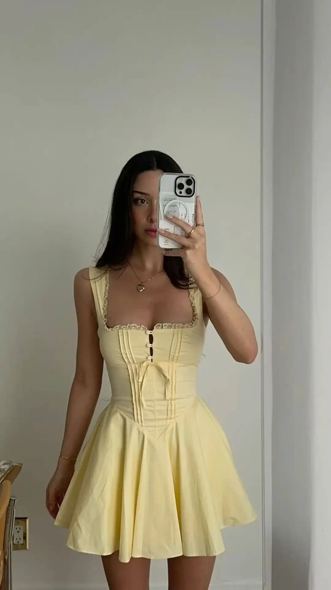 Avec son corset délicatement structuré, son décolleté en cœur souligné de dentelle et sa jupe évasée façon patineuse, Elana est un concentré de fraîcheur et de féminité. Sa teinte jaune pastel illumine le teint et apporte une touche d’insouciance gourmande à votre dressing, comme un rayon de soleil capturé dans une robe.