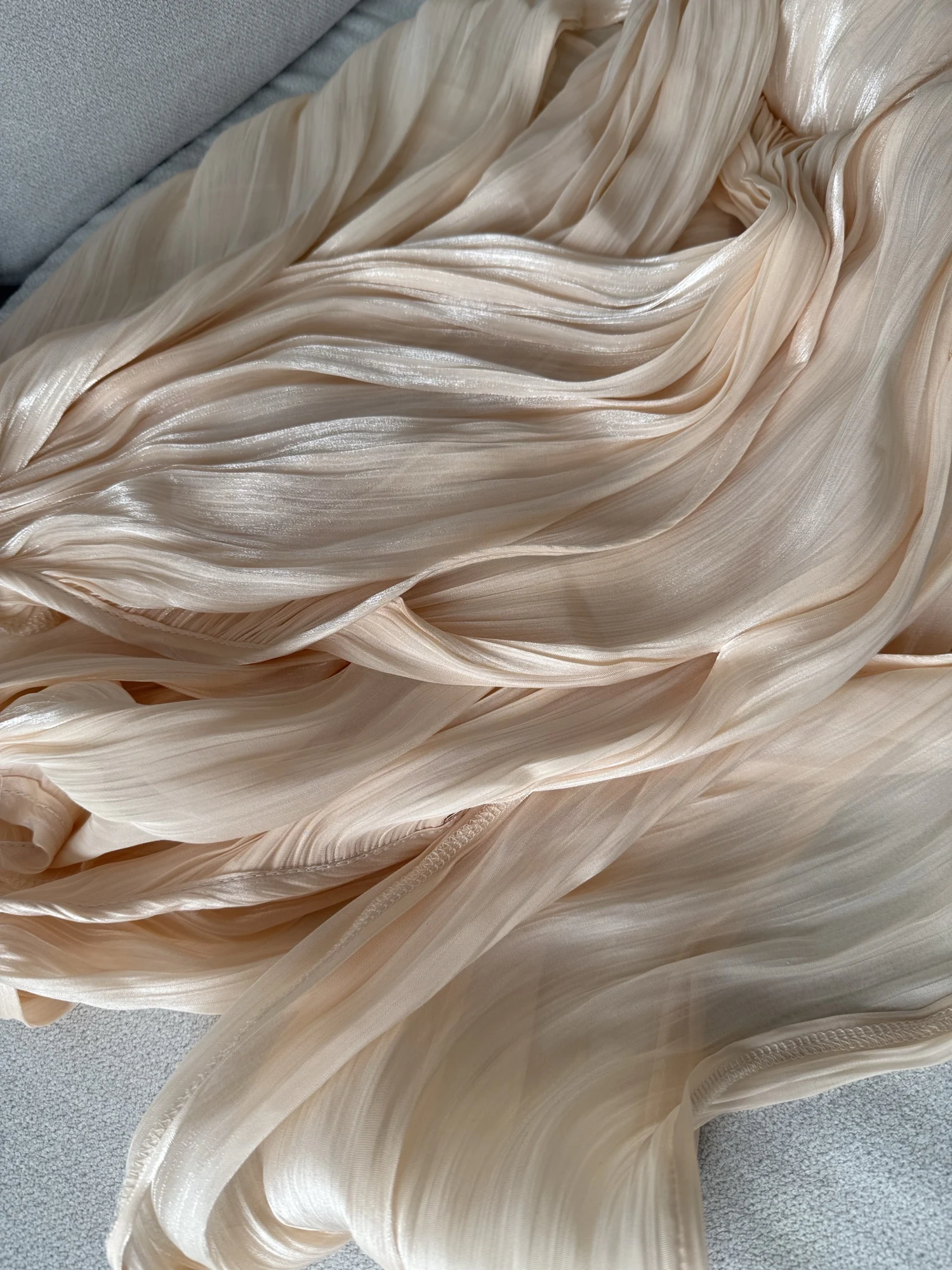 Sa teinte crème rosée capte la lumière avec douceur, sublimant toutes les carnations et enveloppant le corps sans jamais l’enfermer. À mi-chemin entre la robe, la caresse et l’œuvre d’art, Élise est une déclaration : celle d’une femme qui n’a pas besoin d’en faire trop pour tout dire.