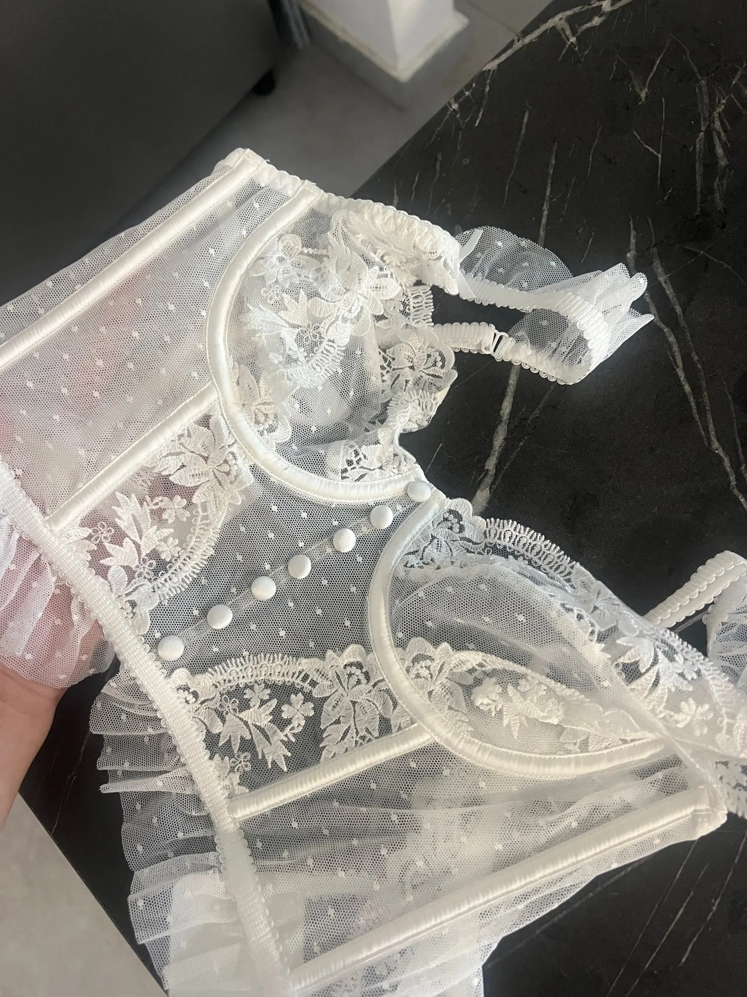 Ses détails raffinés – bordures en dentelle, boutons décoratifs et finition volantée façon lotus – en font une pièce à la fois romantique et audacieuse. L’ultra-fine coque moulée épouse les formes avec subtilité, mettant en valeur la poitrine sans ajouter de volume, pour un rendu naturel et sensuel.