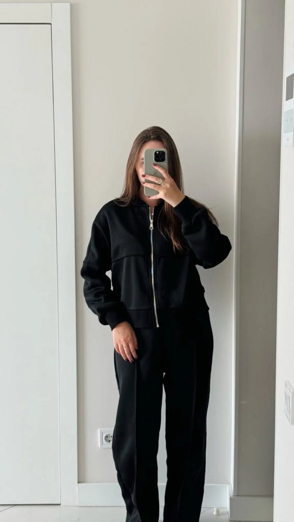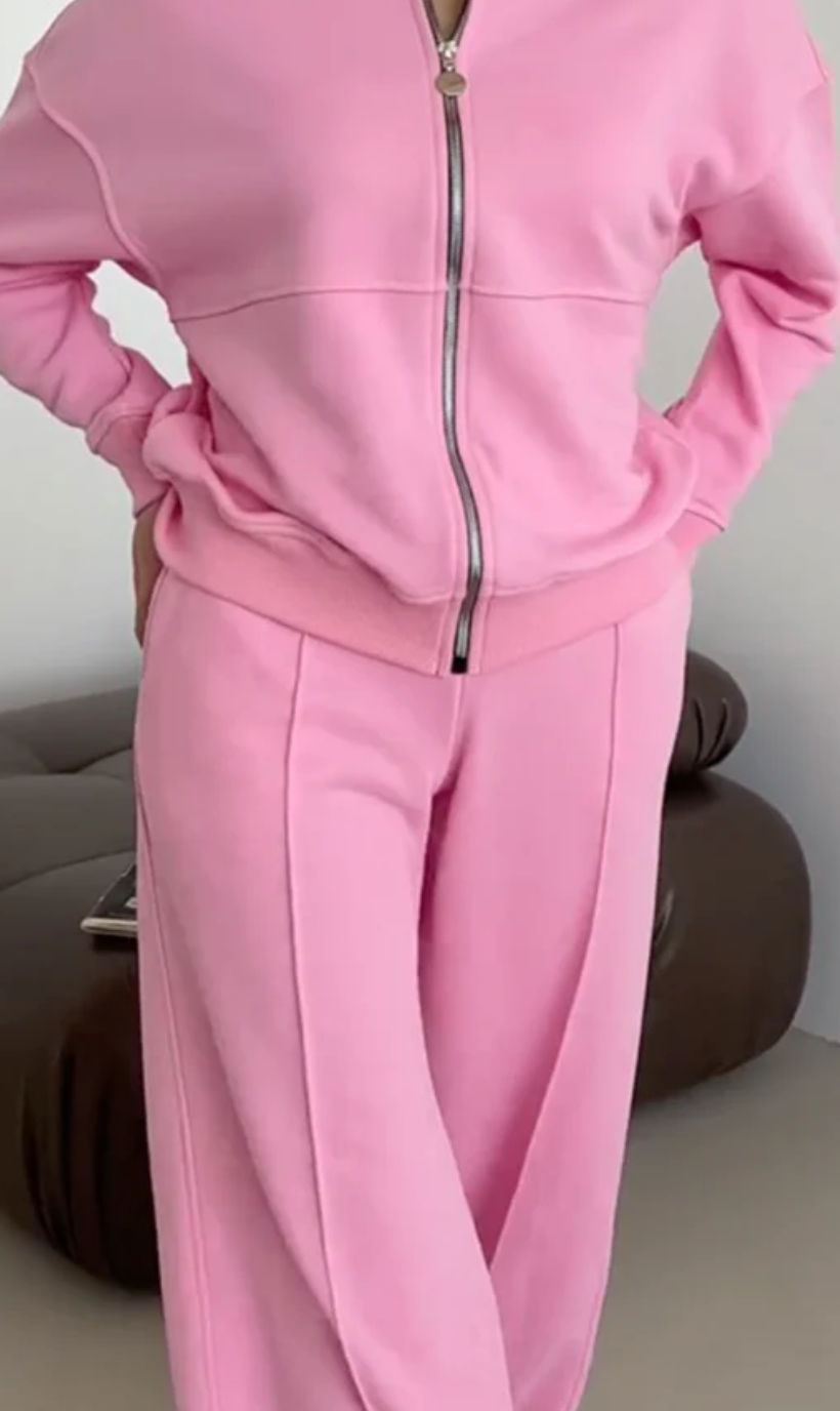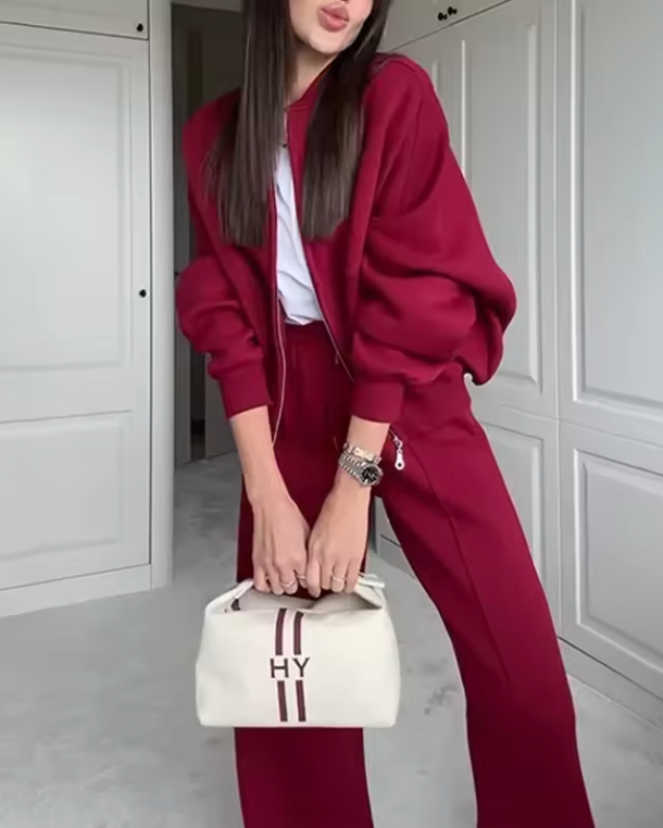 La veste zippée apporte une touche contemporaine et soignée, tandis que le pantalon à la ligne nette crée une allure élégante et affirmée. Conçu dans une matière douce et agréable à porter, cet ensemble se distingue par son tombé impeccable et son style intemporel, facile à adopter en toute saison.