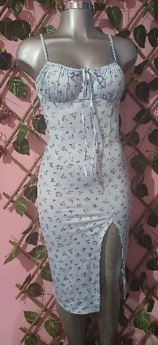 Avec son imprimé fleuri délicat, son corsage à nouer et sa fente subtile sur la jambe, la robe Fiora incarne l’élégance spontanée des journées d’été. Sa coupe midi ajustée épouse les courbes avec douceur, tandis que ses fines bretelles et son décolleté froncé soulignent le buste avec une sensualité naturelle.